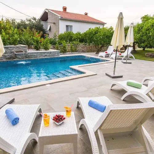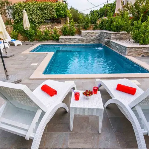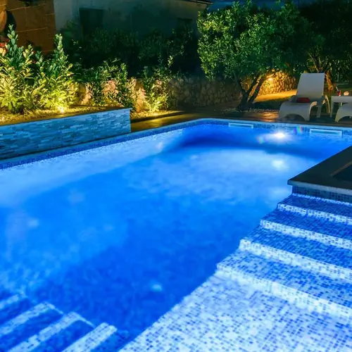 The outdoor area is perfectly designed to provide complete relaxation. Guests of apartments Maris have access to the shared heated pool (30 m2) with massage jets and a waterfall surrounded with sun loungers and parasols, while those who enjoy barbecue can use the shared barbecue in the summer kitchen, which is available on request and with previous notice. Families with children will surely appreciate the play area in the garden which consists of a slide and a swing, while the water fountain in the middle of the lush Mediterranean garden completes the ambiance of a peaceful oasis.