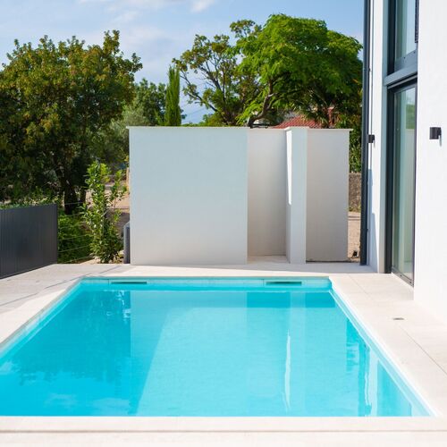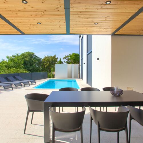 Casa Bela is a modern and spacious villa located in the quiet village of Klimno on the beautiful island of Krk. With its contemporary architecture and thoughtful design, it’s the perfect choice for anyone looking for a luxurious stay near the sea. The villa is designed to bring natural light into every corner, thanks to large glass windows that open towards the sea and the expansive terrace with a heated pool. The entire design combines modern style, clean lines, and bright colors that ensure a sense of space and comfort.