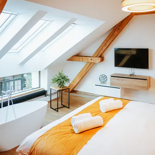 Rooms, services Guests looking for accommodation in Žeraviny are welcome to book 10 nicely furnished rooms at Galerie Mlýn Žeraviny Hroznová Lhota. The hotel is offering you freshly prepared fine local meals in its restaurant every day. The hotel provides a parking space for you without charging any additional costs. Air-conditioned rooms are available for reservation (please take a look at the information sheet of each room to see if it has air-conditioning). If you wish to learn more about the exact scope of services provided by Galerie Mlýn Žeraviny Hroznová Lhota (including those available for an extra fee) or about the equipment of the rooms, you can find the complete list on the information sheet below and on the information sheet of the given room.
