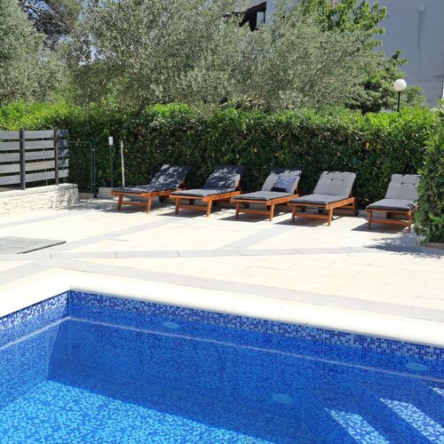 Holiday house for 6 persons with private pool is situated near the city center of Silo and just 300 m from a sandy beach. The total size of the house is 115 m2. Holiday house has 3 bedrooms, living room, kitchen, 2 bathrooms and toilet, terrace, balcony and private parking place. There is also 300 m2 of fenced garden. On the ground floor is a fully equipped kitchen with an electric stove, dishwasher, oven, kettle, fridge with freezer and table for 6 persons. On the ground floor is a living room with Sat tv, bathroom with shower and extra toilet. There is also a game room size 25 m2 with a PlayStation, children's corner and table soccer.