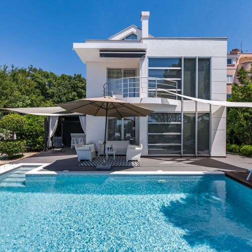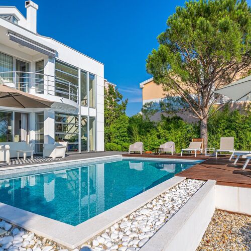 Modern and fully equipped villa with swimming pool, whirlpool, grill, outdoor shower and terrace with sea view has 4 bedrooms and 3 bathrooms. Modern and well-equipped kitchen with dining room and spacious living room with fireplace are available.