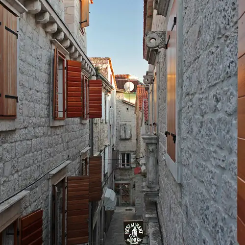 Hotel Monika is located in the very center of the ancient city of Trogir, surrounded by the beautiful streets of the ancient city. The hotel is located about 50 meters from the famous Cathedral of St. Lawrence, and the hotel itself is housed in a beautiful villa that dates back to the 15th century and is protected as a UNESCO cultural monument.