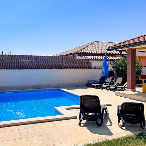 House is situated in a peaceful location, in a place called Seve, near Sisan, 5 Km from Pula. Natural green surroundings, swimming pool, terrace with grilling possibility and free WiFi are the main advantages of this house. House is completely furnished for 6 persons. With its 100 m² size it offers spacious living room, kitchen, three bedrooms and two bathrooms with shower cabin. Kitchen is fully equipped and has electric stove with oven, fridge, dishwasher and water heater. You also have washing machine, WiFi, bed sheets and towels. Air conditioning is only in the living room. Highlight of this property is of course 15 m² big swimming pool with terrace where you can enjoy making barbecue with your family or friends. Parking is on the property. Pets are also welcomed (extra cost). NOTE: A security deposit in the amount of 300,00 EUR must be left and will be returned on the last day in case everything is in order. Check-in is from 16h in Medulin.