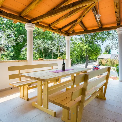 This lovely house is located in a peaceful area in Medulin, about 10km from Pula. Quiet area, 100m2 big lot, terrace, WiFi and grill make this house an ideal choice for your next vacation. The house is modernly furnished and fully equipped to accommodate 8 to 10 people. It has two floors: basement and ground floor. Basement has living room, kitchen, two bedrooms and bathroom. On the ground floor are situated another living room with kitchen, two bedrooms, bathroom and terrace. Both kitchens are equipped and have fridge, electric stove, oven, dishes and dining table. Bedrooms are not air conditioned. There are two air conditioners in the house: one in the basement and the other one on the ground floor. Guests also have washing machine and two parking places. Bed sheets and towels are included in price. Pets are not allowed.