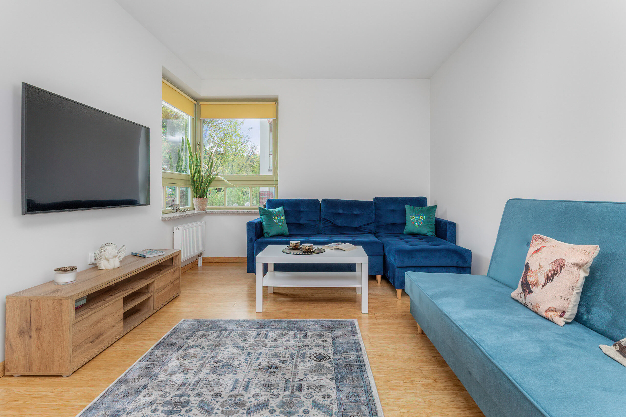 2 sofa beds, complete bedding set, coffee table, TV stand, TV, wardrobe, balcony access.