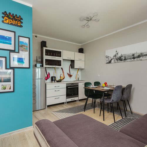 The 39 m² one-bedroom apartment is ideal for 4 people! It consists of a living room with a kitchenette, a bedroom and a bathroom with a bathtub with shower function and a toilet. A cozy apartment can be a great solution for a family trip to Krakow. The living room has a double sofa bed and a flat-screen TV, as well as an exit to the balcony. The kitchenette is equipped with all necessary kitchen appliances for cooking and serving meals. There you will find an induction hob, oven and basic dishes and cutlery. Guests can take advantage of a welcome set of cosmetics (soap, shampoo and shower gel), towels and a wide range of household items such as an iron, vacuum cleaner and washing machine. The property does not provide a parking space (free parking zone).